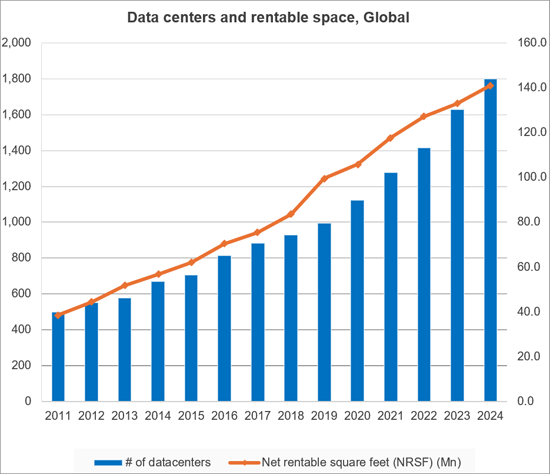 2024年の収益は約1,070億ドルで横ばい、設備投資は7%増の430億ドルに上昇。生成AIブームが成長の一因となっているが、特にAirtrunkのようなプライベートエクイティ主導の大規模案件において、その影響が大きい