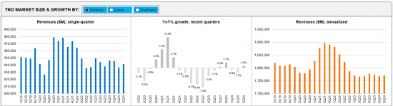 This report reviews the growth and development of the telecommunications network operator (TNO, or telco) market. The report tracks a wide range of financial stats for 140 telcos across the globe, from 1Q11 through 3Q24. For the annualized 3Q24 period, telcos represented $1.77 trillion (T) in revenues (0.1% growth YoY), $262.4 billion (B) in labor costs (0.8% YoY), and $294.6B in capex (-7.7% YoY). They employed approximately 4.45 million people as of September 2024, down 1.5% from the prior year.