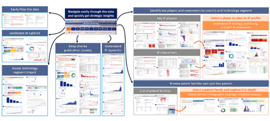 - 特許の動向を動的に探索し、全体像から特定のプレイヤー、技術、特許へと即座に掘り下げることができるインタラクティブなダッシュボードへの1年間のアクセス権付与。
