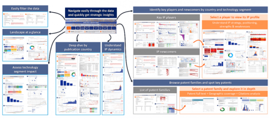 - 特許の動向を動的に探索し、全体像から特定のプレイヤー、技術、特許へと瞬時に掘り下げることができるインタラクティブなダッシュボードへの1年間のアクセス権付与