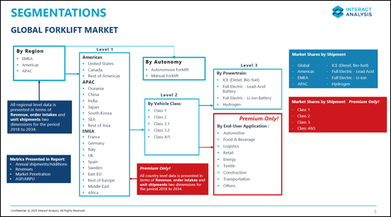 本レポートは、主に製造業の物流環境におけるクラス1~5のフォークリフトに焦点を当て、電動化と自動化の動向を分析しています。