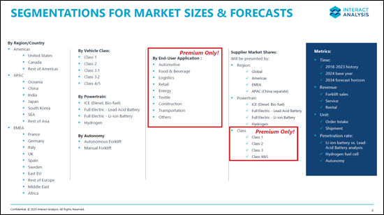 - ・3か月以上にわたる調査・分析および一次調査に基づくボトムアップ分析により、主要フォークリフトメーカーを網羅した包括的データベースを構築
