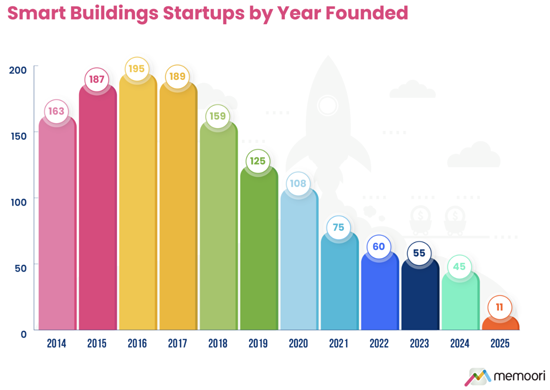 2025年はM&A活動が活発化した年となり、2014年以降に設立されたスタートアップ98社が買収されました。これは2024年同期比で75%の増加となります。2014年以降、スマート商業ビル部門におけるスタートアップ買収件数は累計554件を記録しています。
