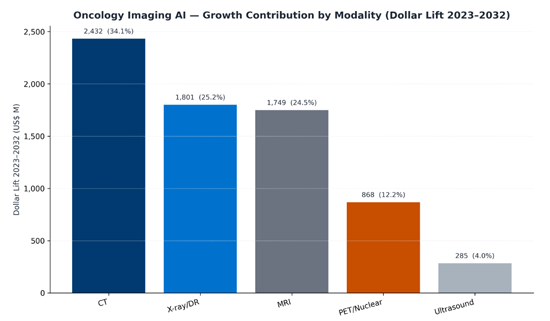 MRIは主要モダリティの中で最も急速に成長しており、PET/核医学は治療連動型画像診断(セラノスティクスを含む)の拡大に伴い、定量化や線量測定指向のAIに対する需要が高まる高付加価値ニッチ市場として成長しています。