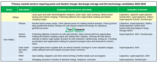 キャプション:パルスおよび最速充放電エネルギー貯蔵を必要とする主要市場セクターと技術候補 (2026-2046年) 出典:Zhar Research report "Energy Storage for Pulse & Fastest Charge/ Discharge Applications (Fusion Power, Laser Gun, Data Center, EV Fastest Chargers, etc.): Technology, Markets 2026-2046"