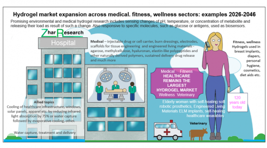 キャプション:医療、フィットネス、ウェルネス分野におけるハイドロゲル市場の拡大 (2026-2046年の事例) 出典:Zhar Researchレポート "Medical and Allied Hydrogels: Markets, Technologies 2026-2046"