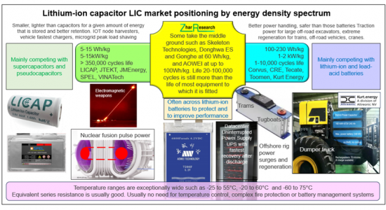 キャプション:エネルギー密度スペクトルによるリチウムイオンキャパシタ (LIC) のポジショニング, 出典:Zhar Researchレポート『Lithium-ion capacitors and other battery supercapacitor hybrids: markets, technology, 2026-2046』